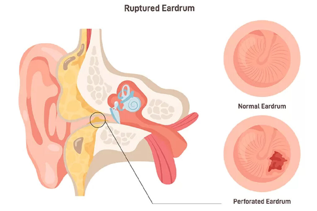 A ruptured eardrum, also known as a perforated eardrum or tympanic membrane perforation, is a tear or hole in the thin membrane that separates the ear canal from the middle ear. The eardrum plays an essential role in hearing by vibrating in response to sound waves and helping convert them into signals the brain can interpret. It also acts as a protective barrier, preventing water, bacteria, and other contaminants from entering the middle ear. When the eardrum is damaged, both hearing and ear protection can be affected.